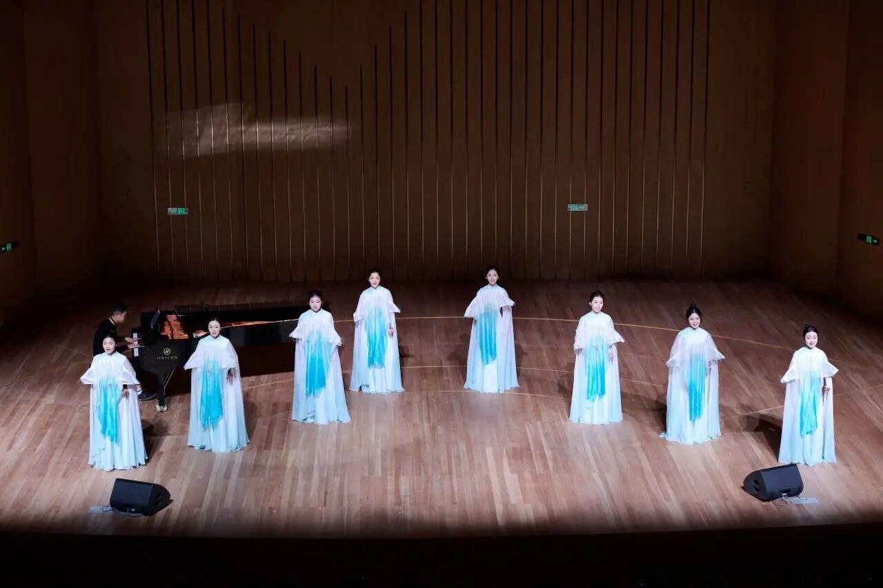 由韩易霖、陈星烨、林优、汪澄、陈亚惜、楼琳、黄益瑞、石佳莹(指导教师:冯晓玲,艺术指导:单良)共同呈现的小组唱《我们是运河的流水》,则为现场带来了悠远流动的意境。作品由黄维诺、董妮作词,印青作曲,旋律如运河之水般绵长婉转,歌声清澈而富有层次,仿佛描绘出一幅文明流淌、生生不息的历史图景,深刻喻示了文化交流如运河汇流,滋养彼此、共创未来的美好愿景。