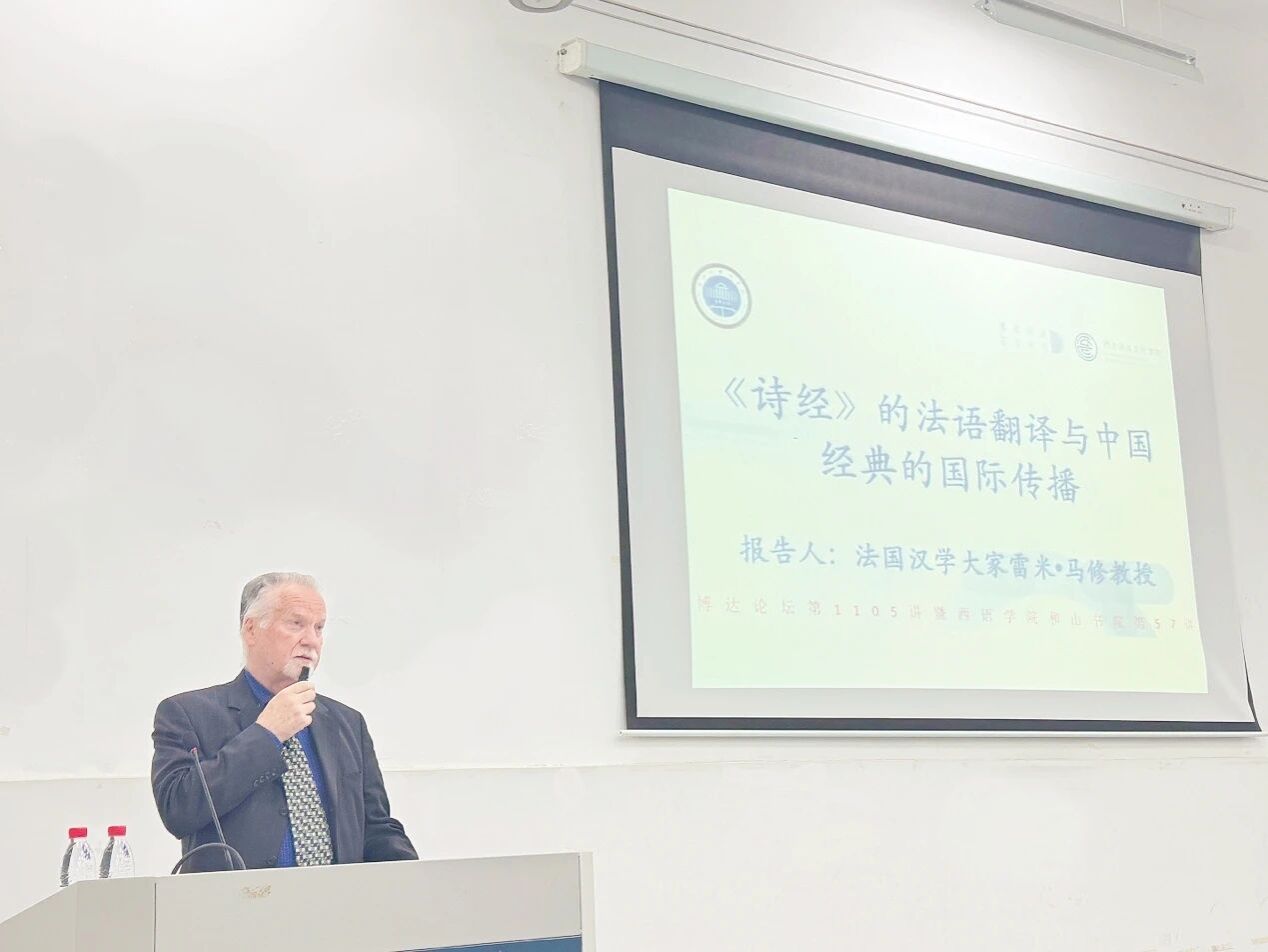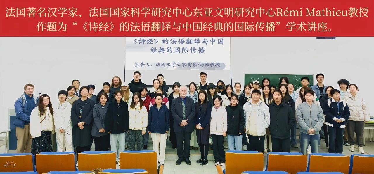 12月12日,法国著名汉学家、法国国家科学研究中心研究员雷米·马修教授作题为“《诗经》的法语翻译与中国经典的国际传播”学术讲座。法语系主任徐曼主持,法语系师生及校内相关学者参加。