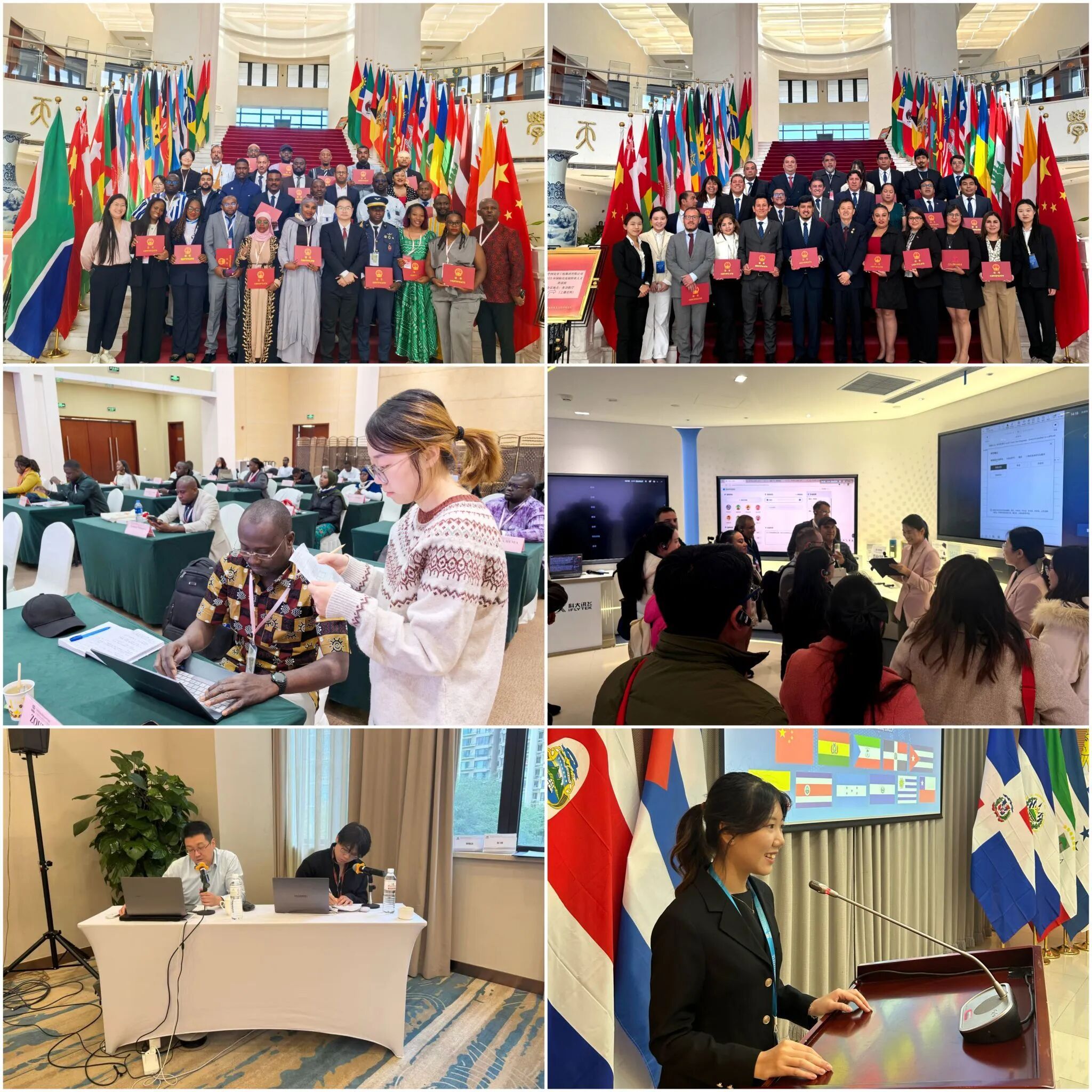 面对高强度、高要求的外事任务,他们临危不乱、精准应对,赢得外宾频频点赞。在“秘鲁医院管理能力建设培训班”期间,焦宇哲承担了“智慧医院发展趋势”主题培训的交替传译任务。面对密集的医学专业术语,他顶住压力、沉着应对,精准传递课程核心内容,保障授课顺利进行。张一诺在“阿根廷锂资源全产业链开发研修班”中,全程负责随班翻译与会议筹备工作,确保各环节高效衔接。马晴雨与张雪雪则在“非洲法语国家信息通信基础设施能力建设研修班”服务中,精准传达“5G”“光纤预制棒”“智慧城市” 等技术概念,获加蓬通信部官员点赞:“展现了中国方案的务实与诚意”。