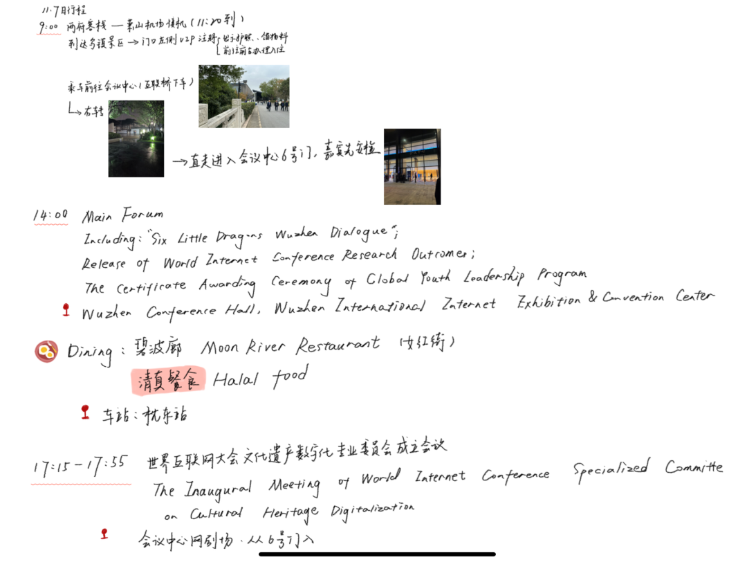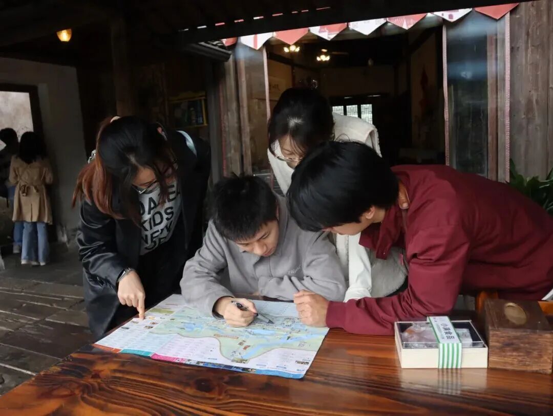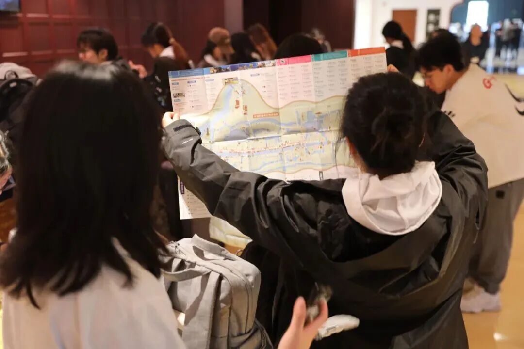 早在上岗前,浙外“小梧桐”们便已经进入“战斗状态”。白天,他们踩着青石板穿街走巷,用脚步丈量每一处会场、路口与接驳点,将乌镇的脉络刻进脑海;夜晚,驻地灯光未熄,他们摊开地图,一笔一画手绘服务动线,用不同颜色标记站点,让路线一目了然。