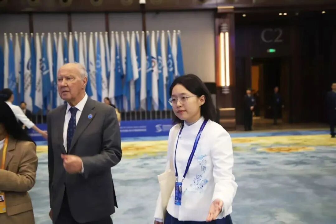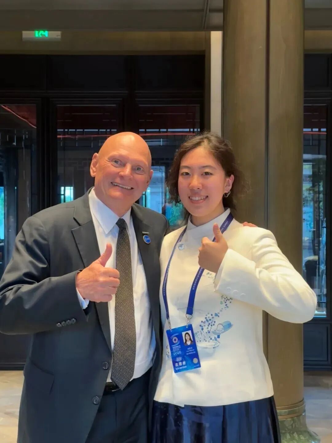 刚斩获第三届“外研社·国才杯”“理解当代中国”浙江省大学生外语能力大赛金奖的23级旅游管理(全英教学)专业高竹含,还来不及庆祝佳绩,便收拾行囊马不停蹄赶赴乌镇,以“小梧桐”的身份,开启了一场用专业与热情连接世界的新征程。她将每日行程精确到分钟,采用中英双语标注行车路线、座位区域,实现高效对接。临别时,嘉宾斯寒女士给了她一个大大的拥抱:“You inspired me a lot.You’re amazing.”这句话成为她此行最美好的回忆。