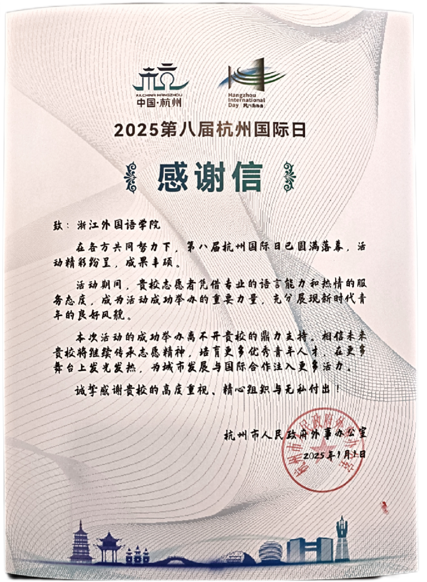 近日,杭州市人民政府外事办公室向我校发来感谢信,对我校青年志愿者和学校对活动的支持表示感谢。信中写到,我校志愿者专业的语言能力和热情的工作态度是活动举办成功的重要力量,活动展现了浙外学子良好的精神风貌和刻在骨子里的责任与担当。