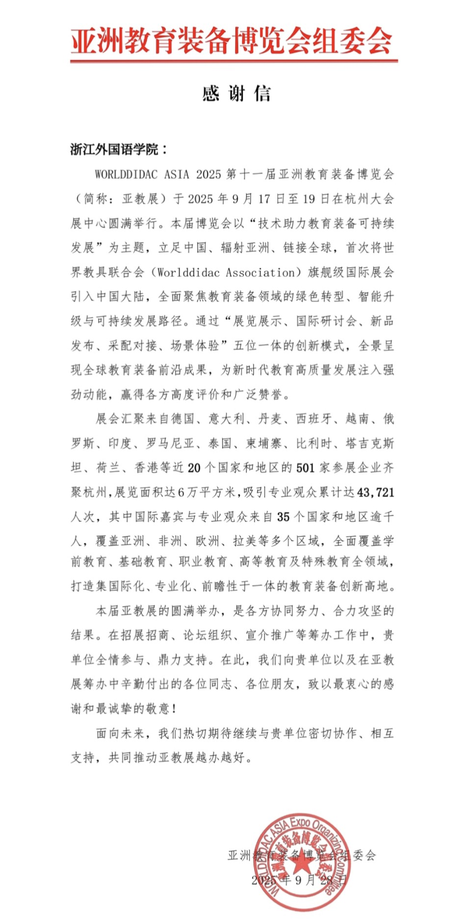 这封感谢信不仅是对参与者的肯定,更是对我校教育实力的认可。面向未来,我们也同样热切期望能与亚洲教育装备博览会密切合作、相互支持,共同推动亚教展美好前景的发展!