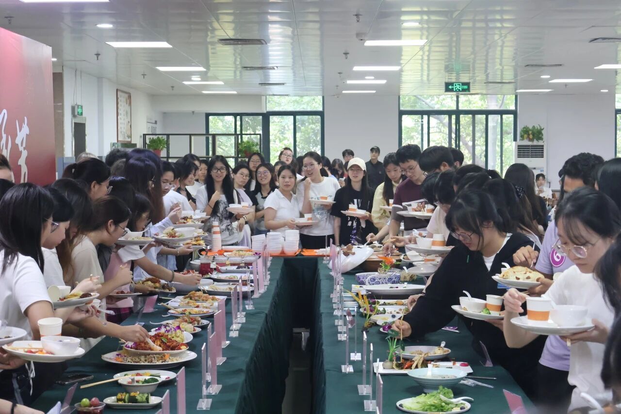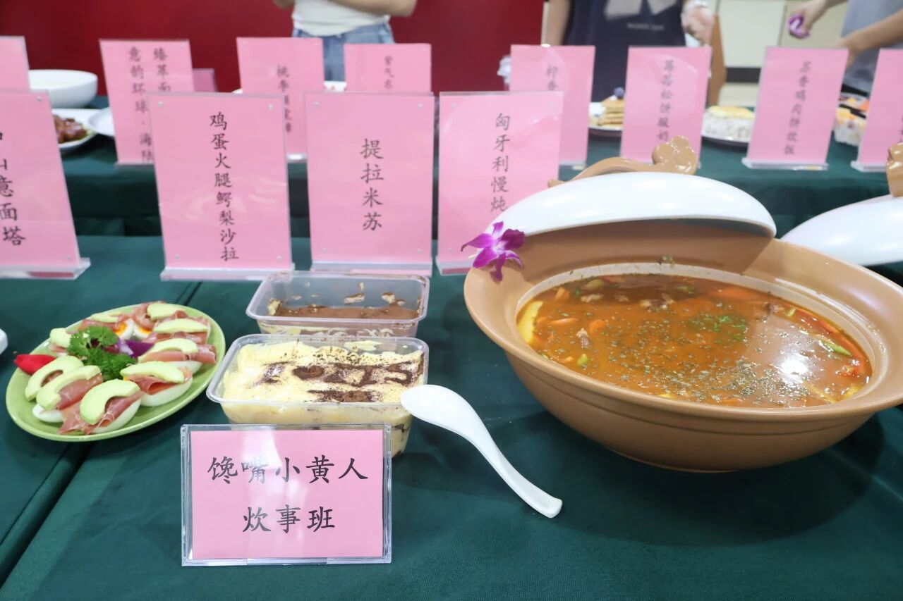来自世界各地留学生们烹饪了来自家乡的美食——酥脆的可颂搭配绵密的奶油带来舌尖上的盛宴;罗宋汤酸甜柔滑的浓郁汤体暖至肺腑;薄薄的春卷皮裹着多种蔬菜清新味蕾。中国学生也展示了祖国风味——京酱肉丝甜咸入味,嫩肉滑舌;紫苏饮品清新沁心,植物香气萦绕齿间;饺子鲜嫩多汁的肉馅与薄滑面皮在口中交融。学生处处长陆卫斌老师在现场即兴发挥,制作了两道菜供同学们品尝,他希望同学们人人都能掌握做饭这项技能,表达了老师对同学日常饮食的关心。