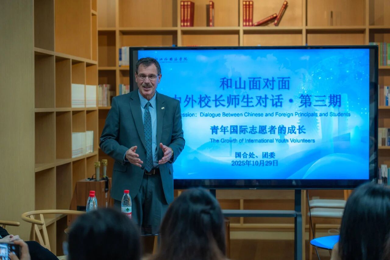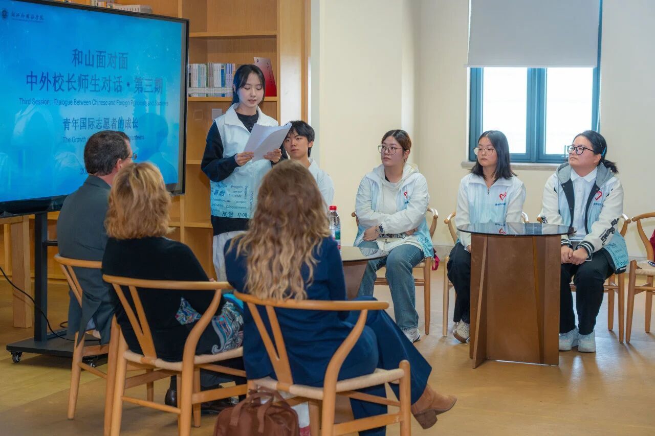 秋光映室,思想共鸣。10月29日,“和山面对面:中外校长师生对话”第三期活动在弘文馆举行。美国密苏里南方州立大学校长迪恩·范盖伦及其夫人玛丽·范盖伦应邀出席,与第五届全球外国语大学联盟校长论坛志愿者代表座谈交流,共话青年国际志愿者成长与担当。我校副校长、党委委员柴改英出席活动。