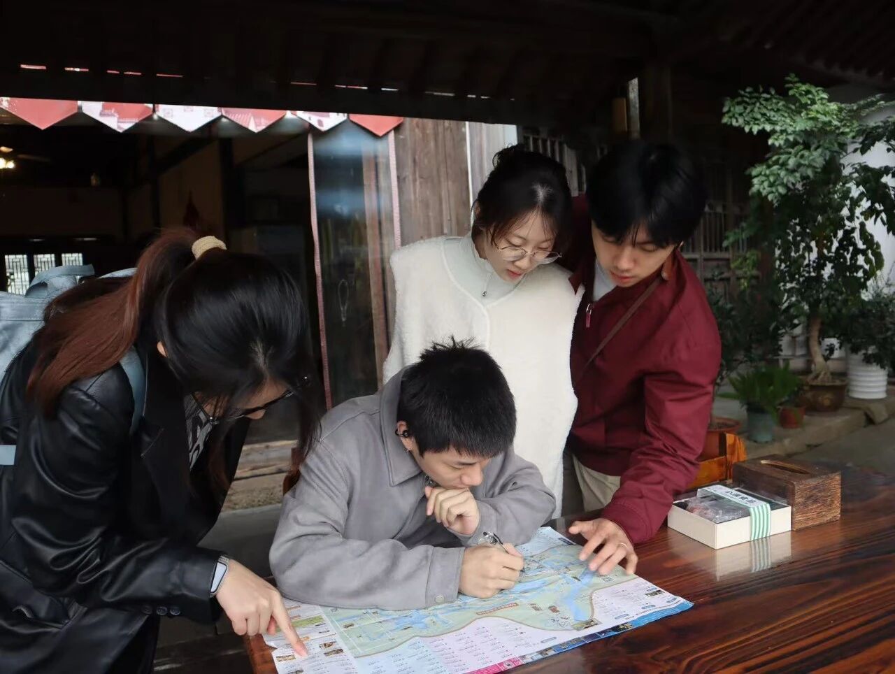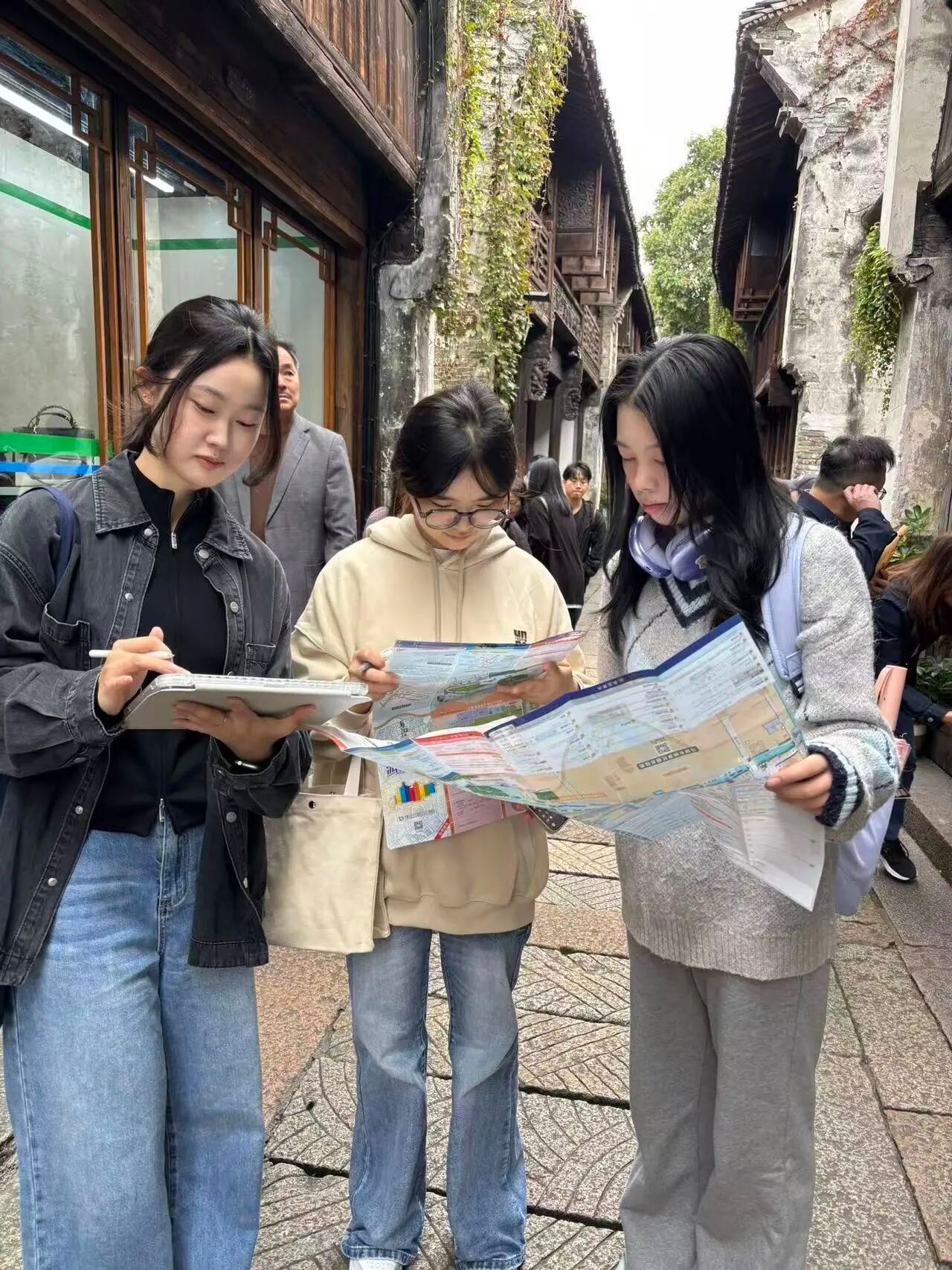 抵达乌镇,意味着实战的开始。浙外“小梧桐”在老师的带领下迅速投入高强度的动线训练与点位摸排中,用最短的时间,把乌镇西栅的北线、南线以及会展中心的各个重要服务点位、桥梁及建筑名称,都牢牢刻进脑海。从晨光熹微到暮色四合,他们手执地图,穿行于水巷石桥之间,走遍每个服务站、每处嘉宾动线、每家指定酒店。一步一印,皆是责任;一眼一记,皆为专业。“日行两万步”,不是数字,而是态度。正是在这样日复一日的深入踏勘中,“小梧桐”们对这座“来过,便不曾离开”的古镇,从陌生到熟悉,从地图上的符号,变为心中的立体舞台。