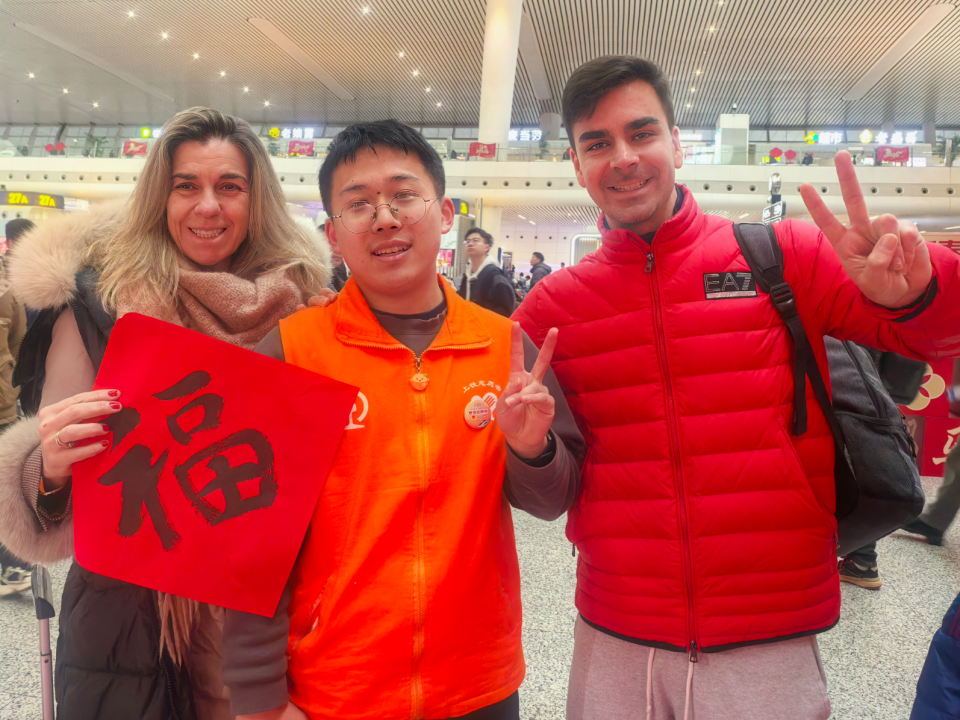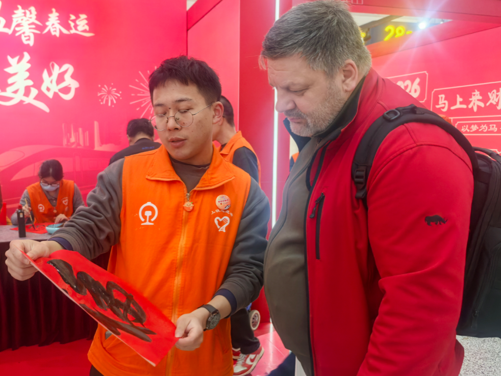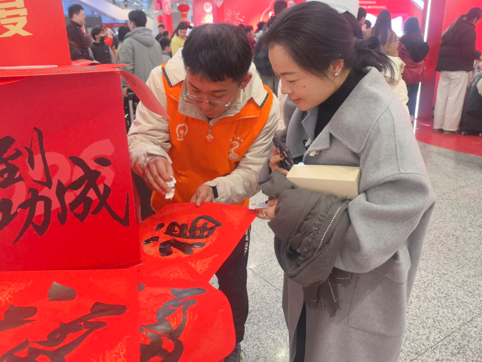 今年春运,我负责主题服务,为往来的旅客盖章、写福字。最让我温暖又难忘的是,每当有外国朋友来到服务台前,我都会用外语向他们介绍我们的春节,介绍写春联写福字的由来。看着他们眼里的惊喜与欢喜,我心里也满是感动。我把一张张福字送给每一位旅客,也把最真挚的祝福、最温暖的中国年味,传递到了每一个人心里。