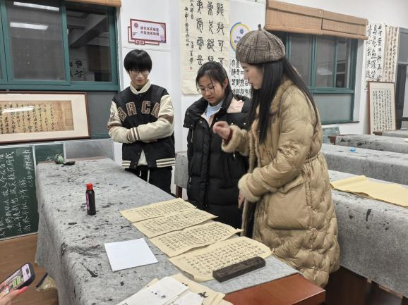 2025年12月16日,博雅书画社以书法交流为主题,指导老师围绕书法创作与行业经验进行生动分享,并现场对同学们的习作逐一细致指导,提高了大家的书法认知与实操能力。2025年12月20日,社团组织同学开展粉笔字板面书写活动,顺利完成多块黑板字的书写与美化,也为社员提供了书法实战与团队协作的实践机会。